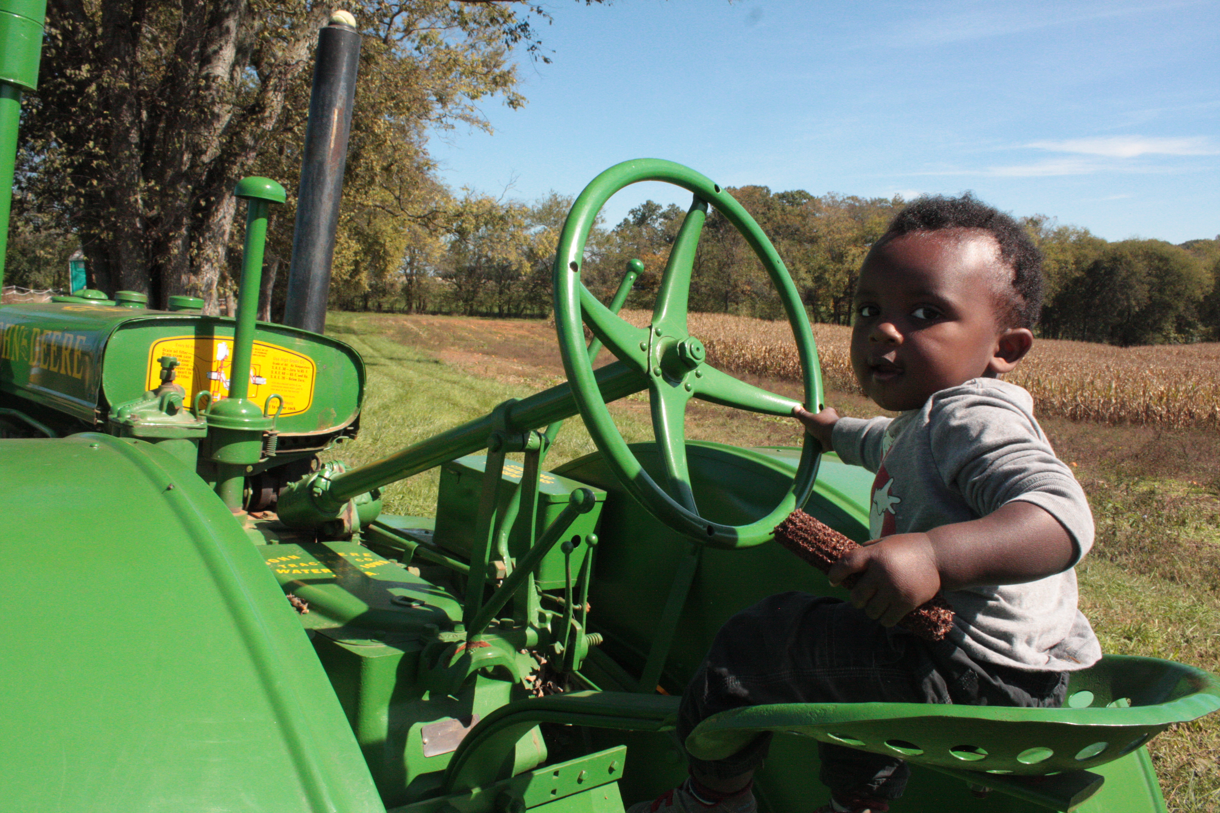 Driving the tractor was a huge hit, too. What a little farmer–ear of corn in one hand, steering wheel in the other.